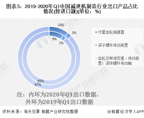 近年來,除“齒輪及其他變速、傳動裝置:滾珠螺桿傳動軸”外,其余產(chǎn)品的出口份額均有所下降。2020年第一季度,“齒輪及其他變速、傳動裝置:滾珠螺桿傳動軸”的出口額占到了中國減速機(jī)制造行業(yè)出口產(chǎn)品總出口額的89%。